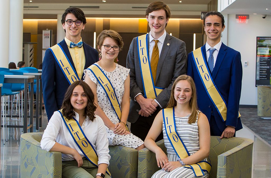 The 2019-20 International Thespian Officers (clockwise from top left): Keith Peacock, Maura Toole, Spencer Angell, Nic Fallacaro, Anna Hastings, and Abby Stuckrath. Photo by Corey Rourke.